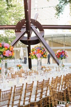 The evening began with a romantic ceremony at the Arlington Hall at Lee Park Pavilion. Flowing green foliage and a pallet of apricot, peach, coral, and fiery orange blossoms covered the iron columns and creeped across the top of the pavilion structure. The bride’s choice of blue and white accent pieces created a joyful and romantic atmosphere when filled with a cheerful palette of color. Plenty of candlelight created an all the more vibrant scene.